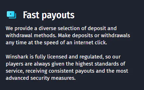 About WinShark casino withdrawal time, it varies depending mainly on the method you choose. Typically, e-wallets and cryptocurrency take 24 hours before users receive their money, while bank transfers and credit/debit cards usually range between 3 – 5 days. Also, larger withdrawals may require longer processing and additional verification to meet regulatory obligations.